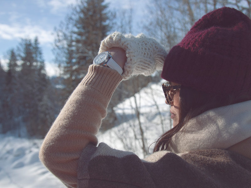 准备出发,在腕表与忠狗的陪伴下享受阳光雪景。