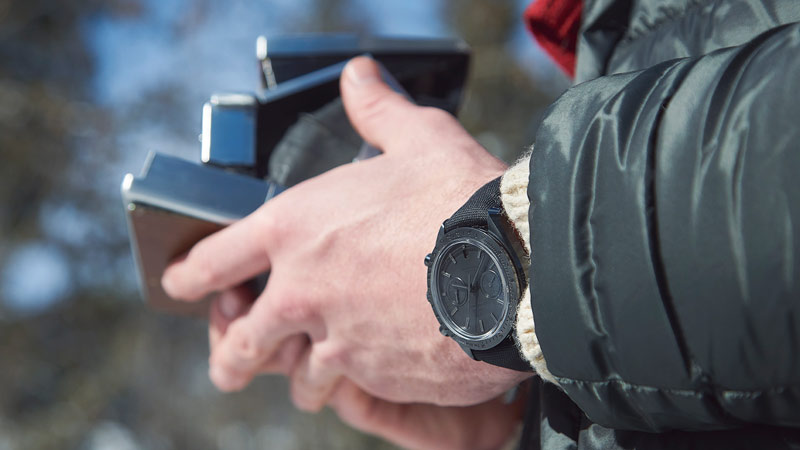 超霸系列“月之暗面”墨黑款腕表与皑皑雪白的室外景色形成鲜明对比。它之所以如此命名有着特别理由。黑色陶瓷表壳、黑色陶瓷表盘搭配黑色织物表带,正是这款超凡不俗的月球表。