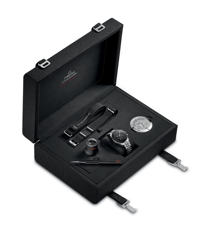 手动上链计时机芯,配备纵轮装置和宝玑摆轮游丝,并饰以PVD镀层Sedna 18K金饰面。陪伴人类登上月球的机芯。
